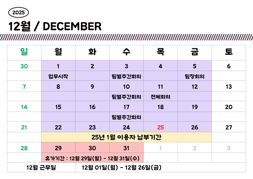 2025년 12월 센터 일정표 입니다.